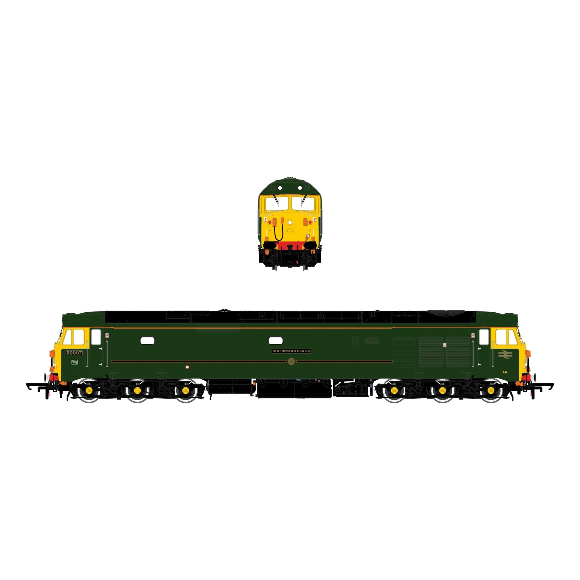 Auch fast vier Jahrzehnte nach ihrer Neulackierung ist die Lokomotive 50007 noch immer umstritten. Sie wurde im Februar 1984 im Rahmen der G-Serie in den Farben der Great Western Railway (Great Western Railway) – Grün mit Zierlinien, gegossenen Nummern und Doppelpfeil – ausgeliefert.W150 Die für das folgende Jahr geplanten Feierlichkeiten. Gleichzeitig verlor es seine Herkules um an den 50. Todestag des Komponisten zu erinnern Sir Edward Elgar – Die Lokomotive hatte keinerlei Verbindung zu Brunels berühmter Eisenbahnlinie. Gerüchten zufolge sollte sie die erste einer Reihe von Lokomotiven der Baureihe 50 sein, die nach berühmten Persönlichkeiten benannt wurden. Die heftige Gegenreaktion verhinderte jedoch weitere Umbenennungen. Bis zu ihrer endgültigen Ausmusterung 1994 wurde sie mehrmals modernisiert, wobei sich ihre Lackierung jedes Mal dezent veränderte. Unser Modell repräsentiert die klassische Lackierung der Network SouthEast-Ära von 1988 bis 1991 mit durchgehendem orangefarbenem Zierstreifen.