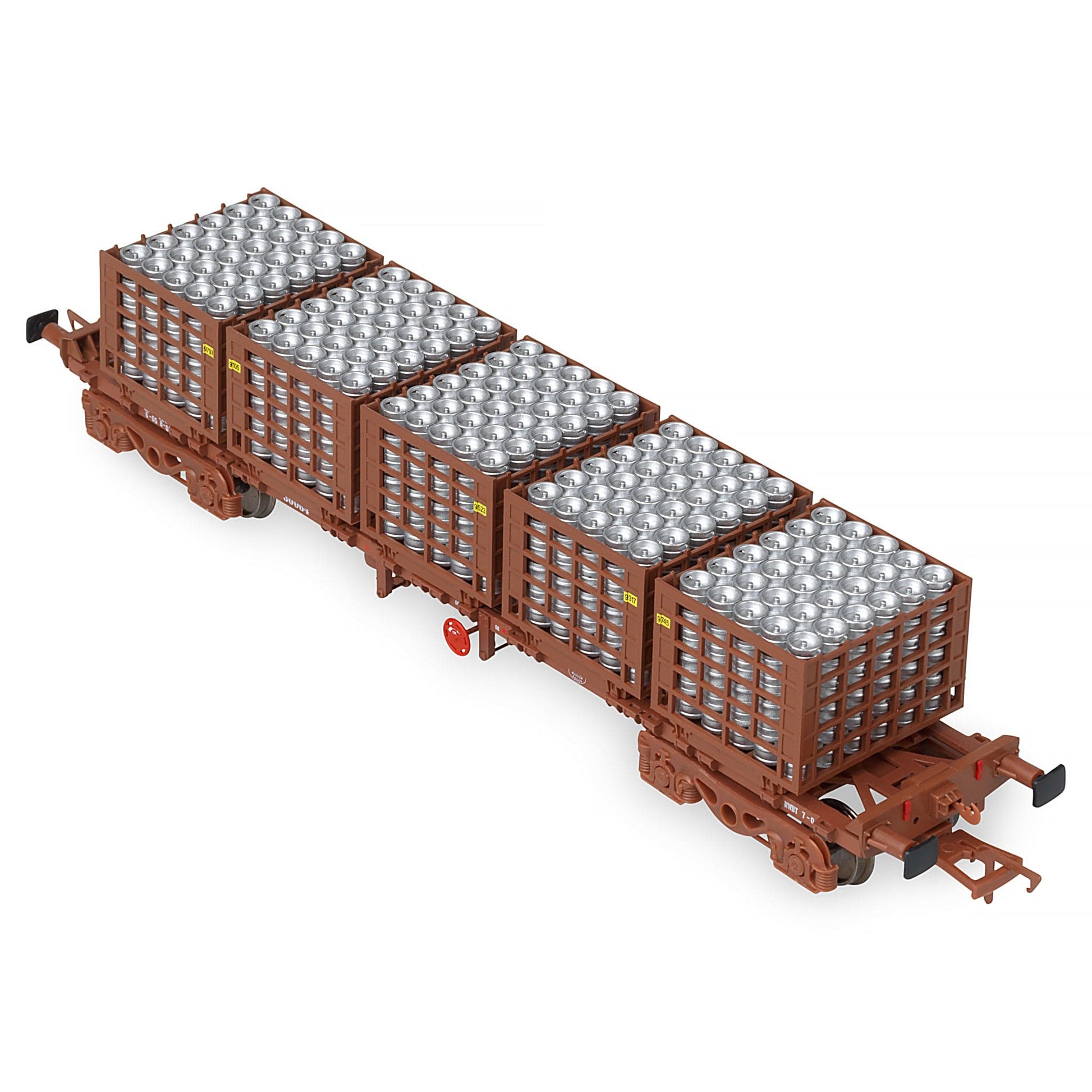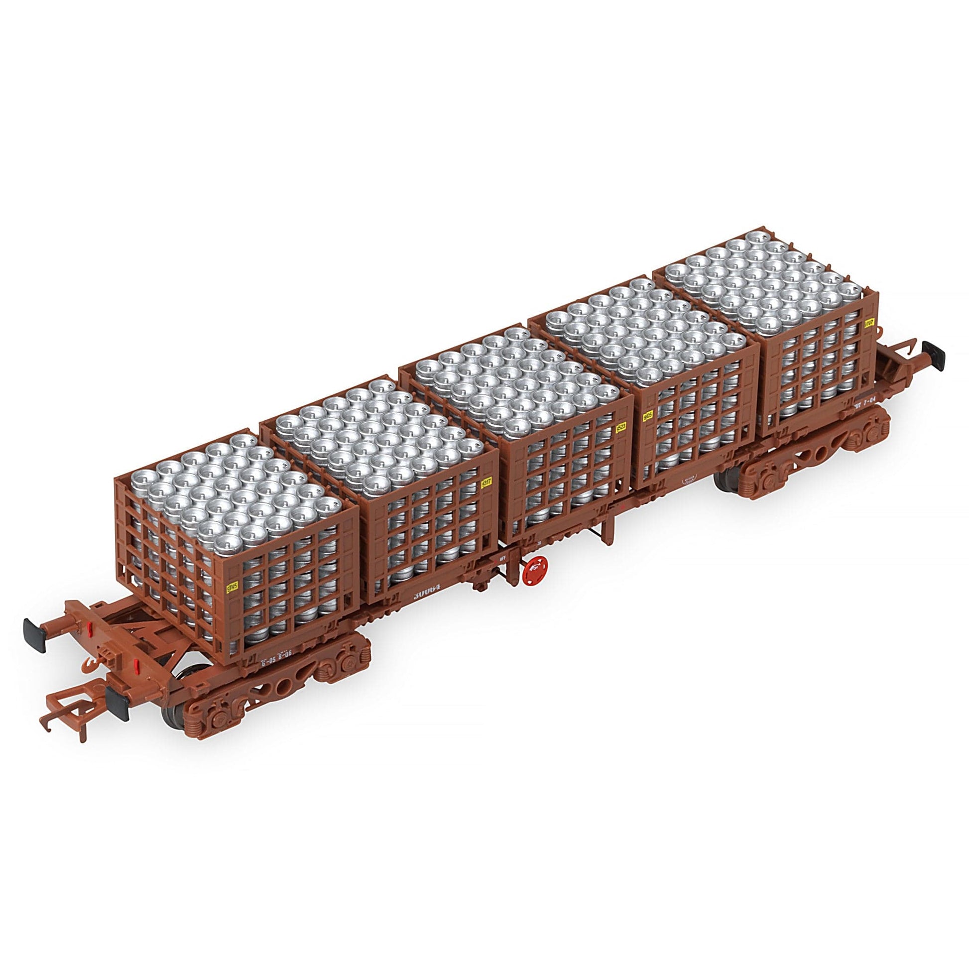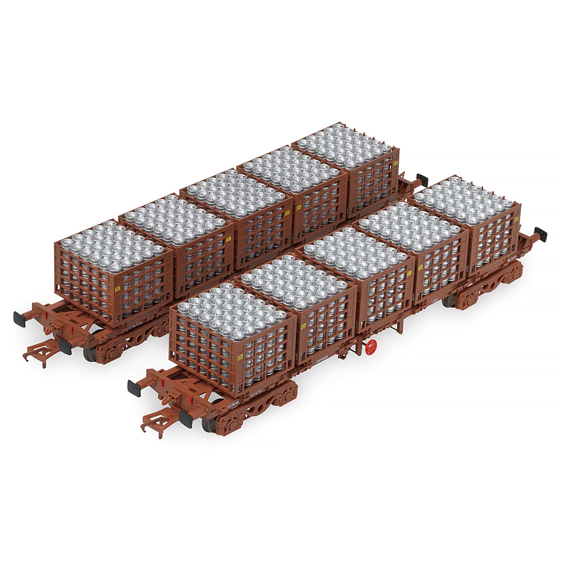 Doppelpackung mit zwei 42-Fuß-Flachfasstransportern, Jeder Käfig war mit 5 präzisen Bierfasskäfigen bestückt, jeder Käfig bis zum Rand mit silbernen Bierfässern gefüllt.