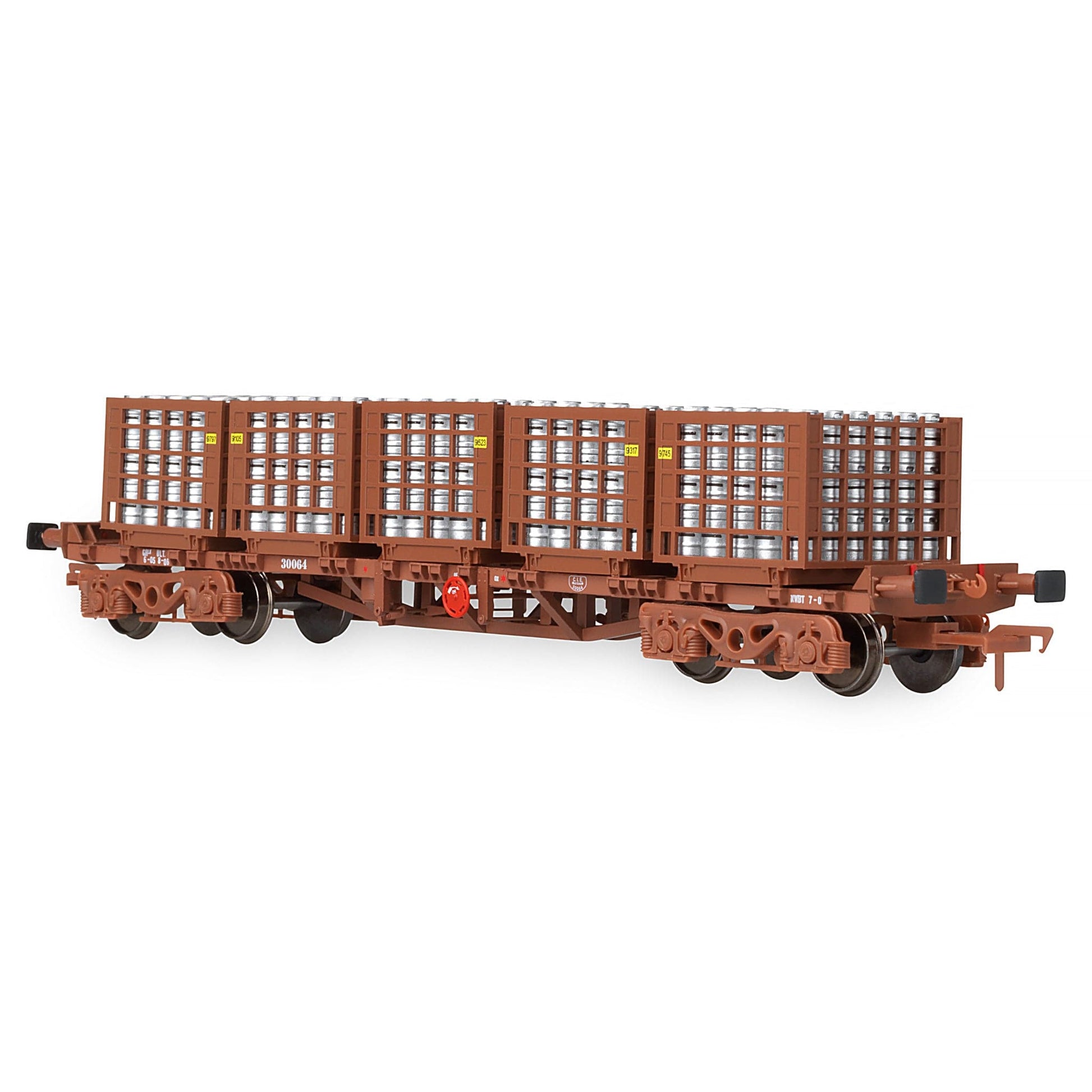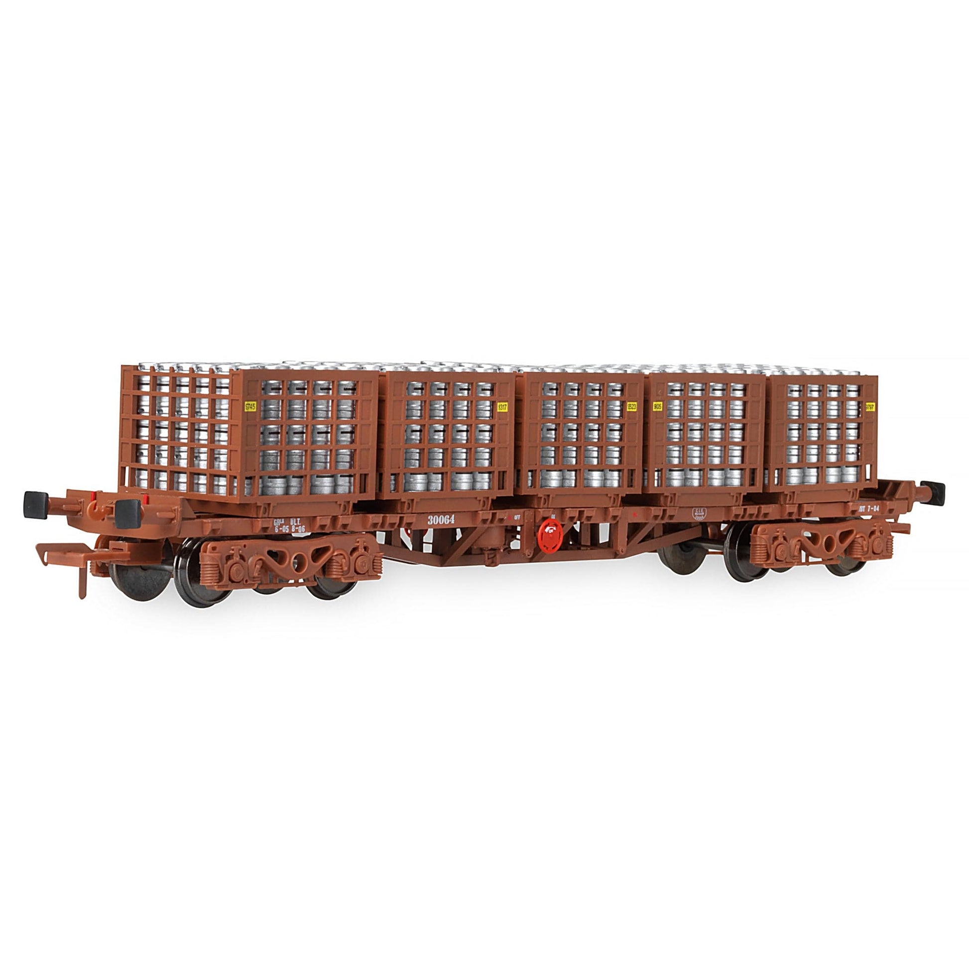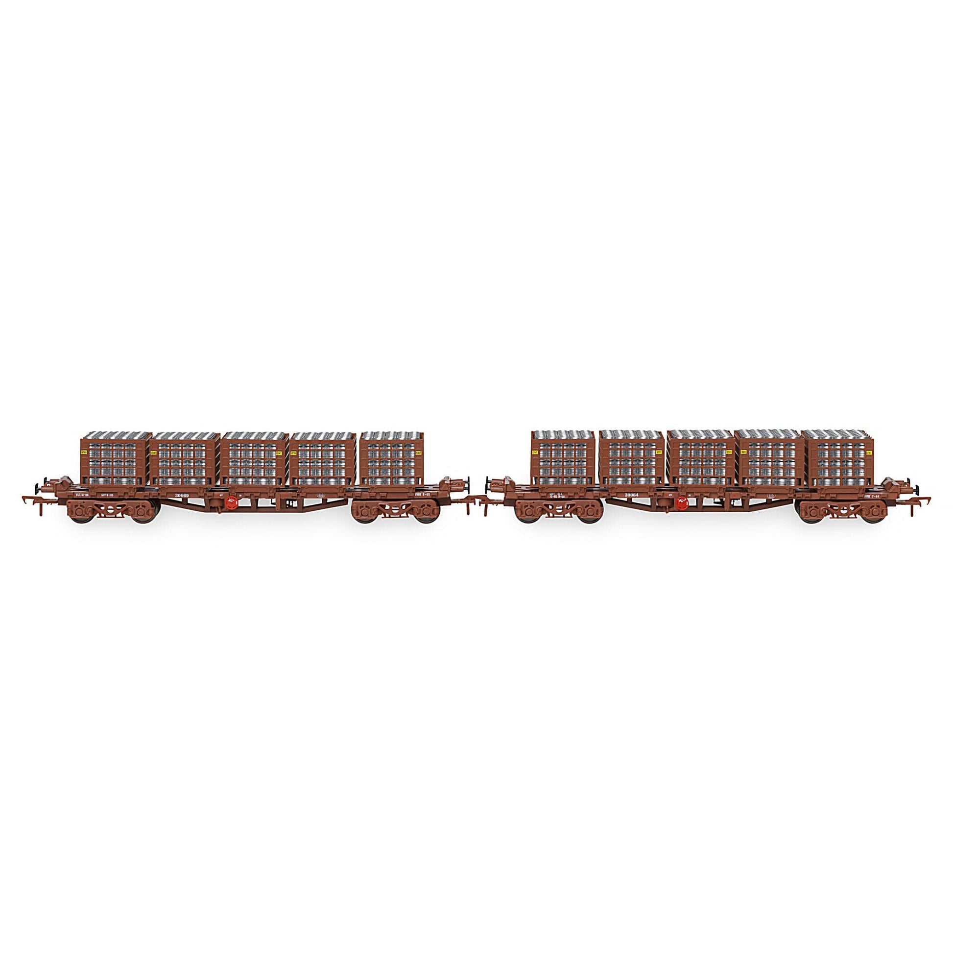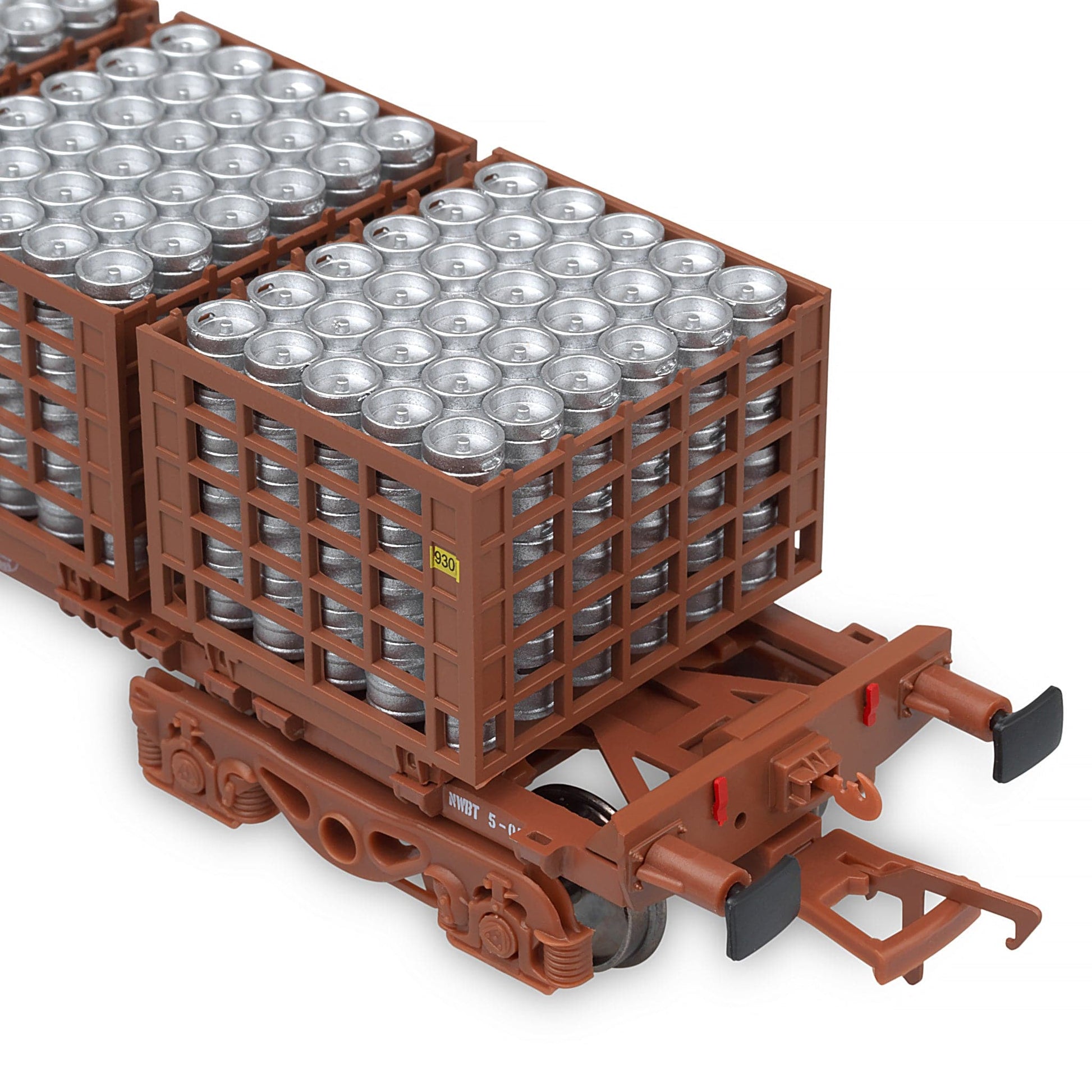 Doppelpackung mit zwei 42-Fuß-Flachfasstransportern, Jeder Käfig war mit 5 präzisen Bierfasskäfigen bestückt, jeder Käfig bis zum Rand mit silbernen Bierfässern gefüllt.