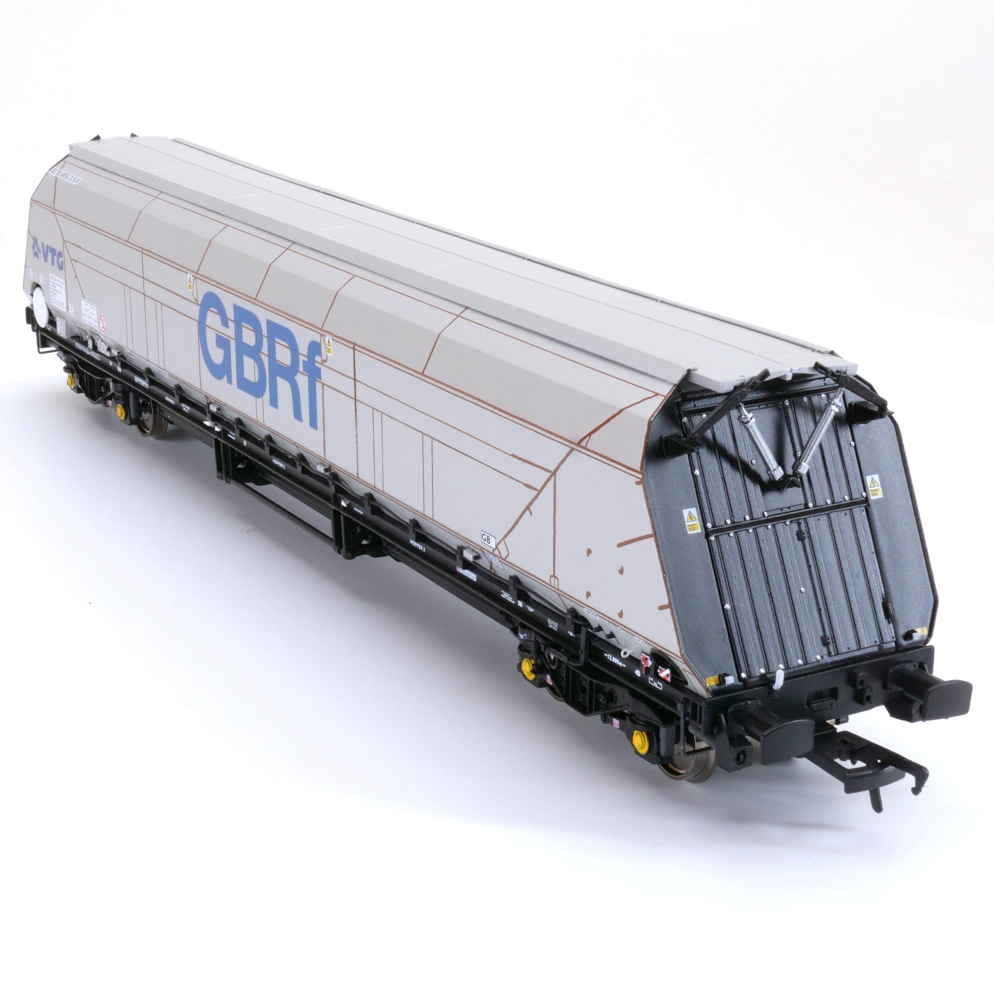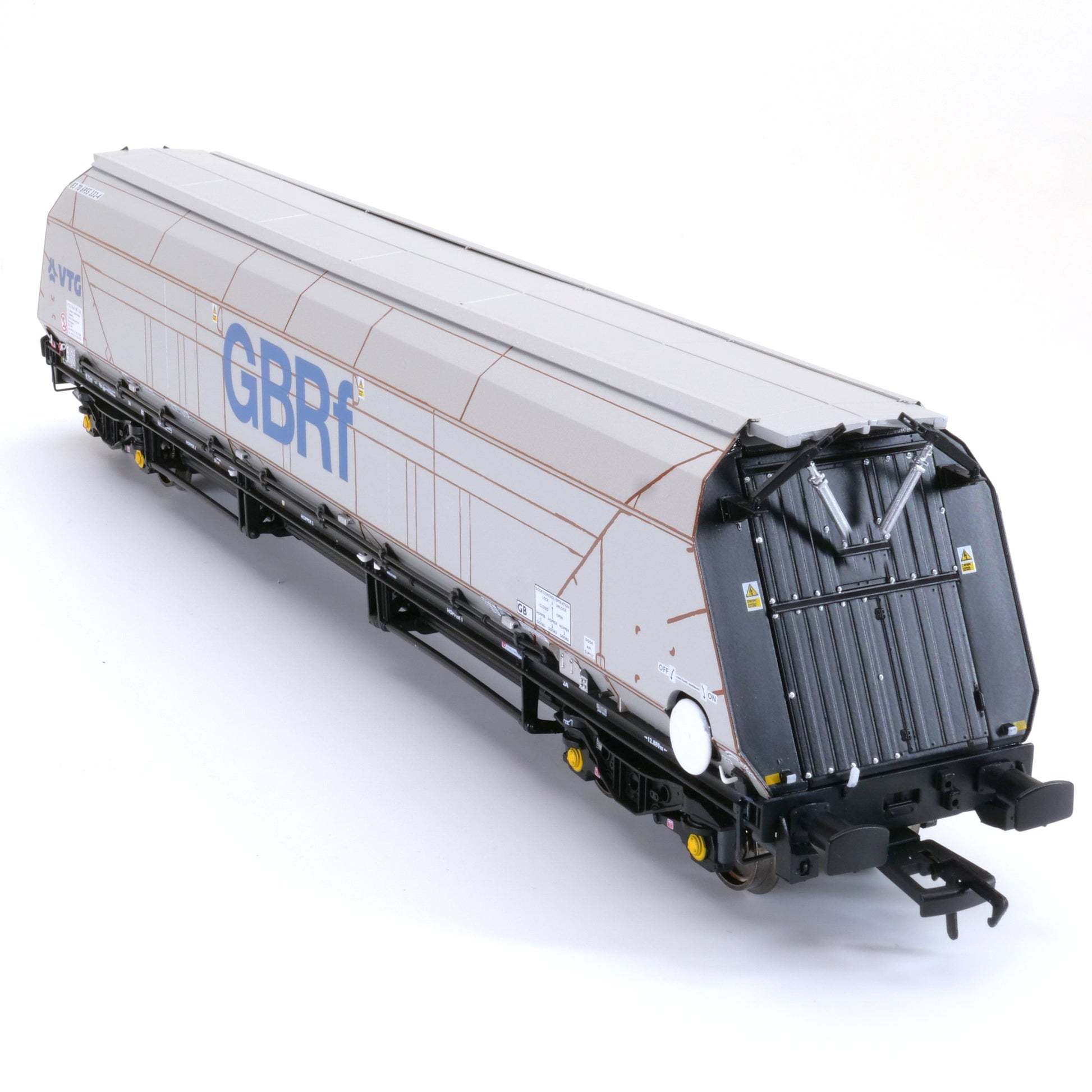 Der Accurascale IIA Biomasse-Trichter weist gegenüber dem zuvor angekündigten Kohle-Trichter HYA/IIA einige bemerkenswerte Änderungen auf. Neben den markanten Dachklappen und der Bedieneinrichtung verfügt er über die von WH Davis überarbeitete Konstruktion der Endplatten mit nur sieben breiteren vertikalen Versteifungen anstelle von 15 bei den in Rumänien gefertigten Modellen. Hinzu kommen eine Türsteuerung und vier zusätzliche kleine Kästen pro Seite, die die Magnetschalter für die Tür-/Trichterbetätigung enthalten.