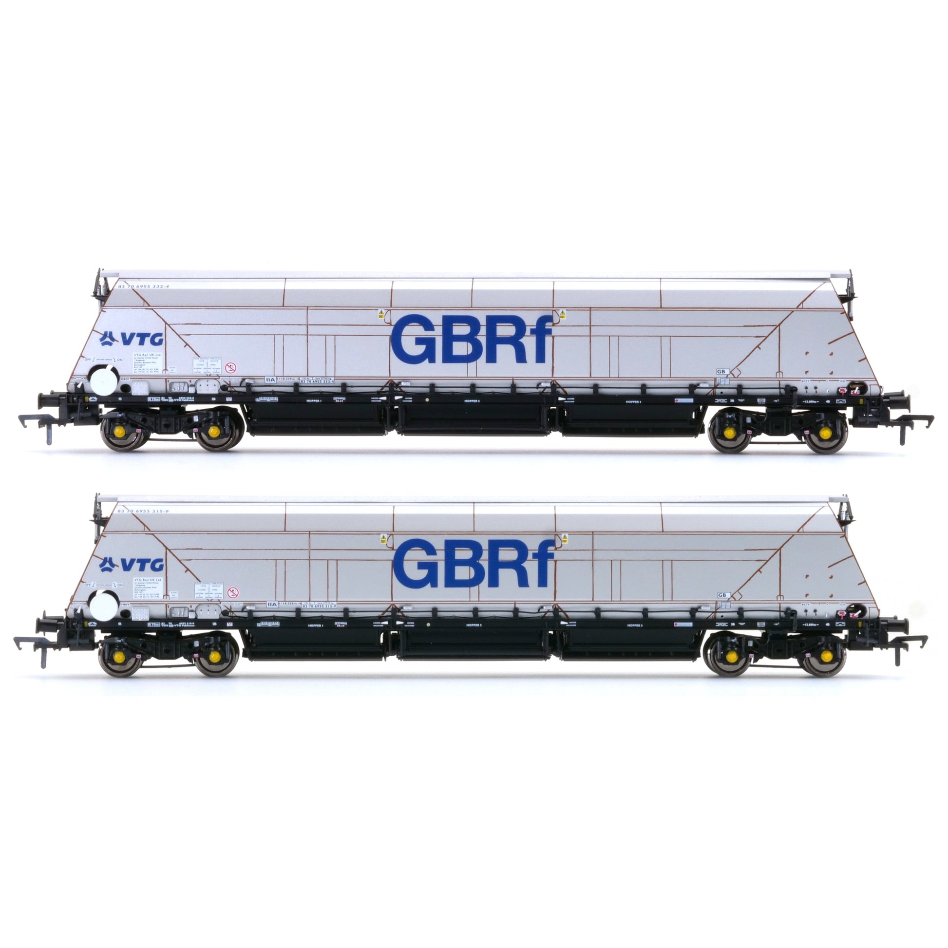 Dieses Paket enthält zwei IIA Biomasse-Drehgestell-Trichterwagen, 'u„npainted“ mit GBRf- und VTG-Logos – „Ghosted“ ehemalige First-Logos